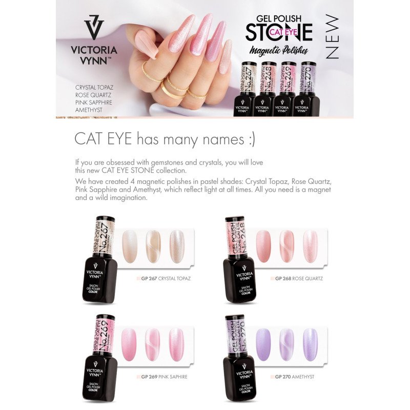 Gel Polish är en produktserie av gellacks av högsta kvalité från Victoria Vynn. Serien är lättarbetad med en medium-tjock konsistens och kommer med en platt borste vilket underlättar en jämn applicering. Detta är en del av Gel Polish - Cat Eye kollektion och kräver magnet för att skapa mönster.